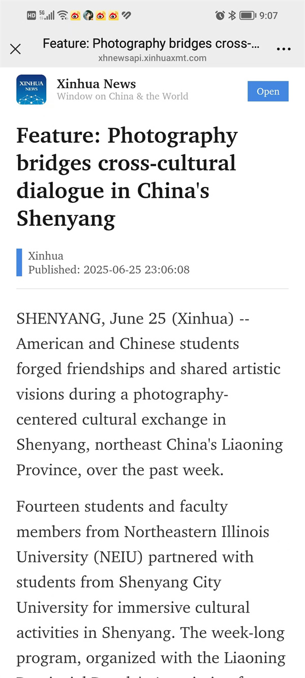 6月24日,“光影之桥——美国东北伊利诺伊大学艺术学院师生中国行”结束了在辽宁省沈阳市的活动。在历时7天的时间里,沈阳城市学院与美国东北伊利诺伊大学的学生联合采风,进行文体交流。中美大学生通过“青春对话”,结下了深厚友谊。