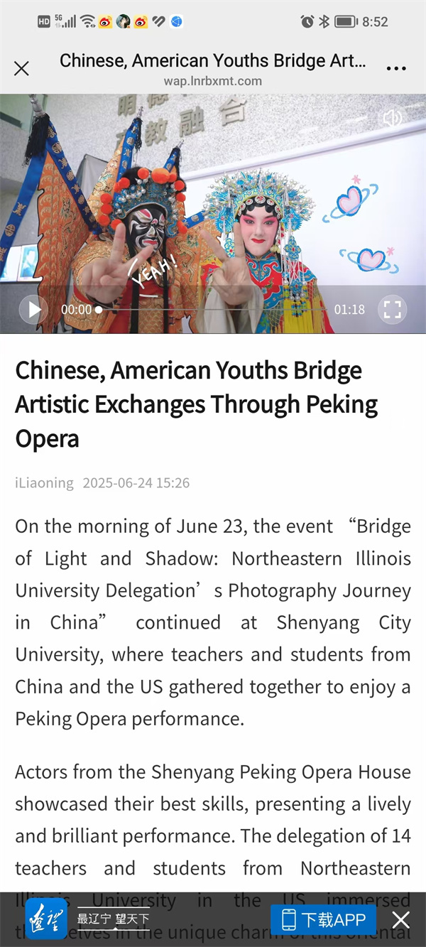 624日,“光影之桥——美国东北伊利诺伊大学艺术学院师生中国行”结束了在辽宁省沈阳市的活动。在历时7天的时间里,沈阳城市学院与美国东北伊利诺伊大学的学生联合采风,进行文体交流。中美大学生通过“青春对话”,结下了深厚友谊。
