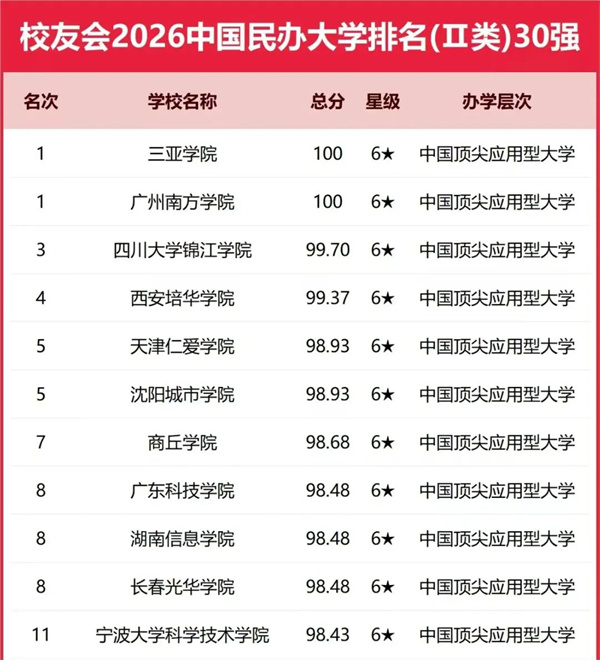 又进一步!沈阳城市学院位列全国第五名!艾瑞深校友会网发布2026中国民办大学排名30强
